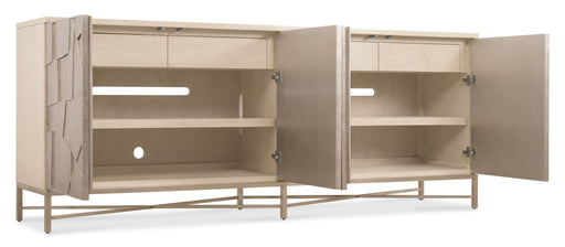 Redefine your entertainment setup with the stunning Shelly Credenza from the Melange collection. This transitional piece features a soft white exte...