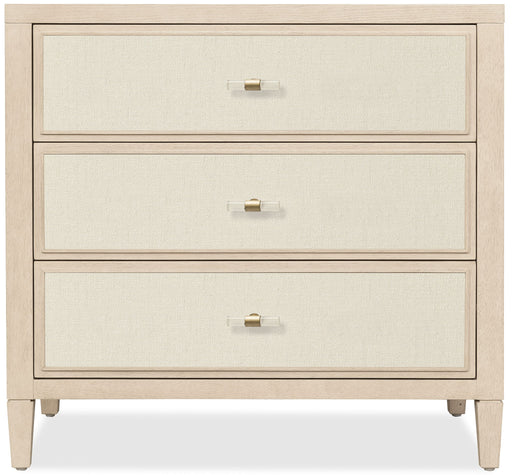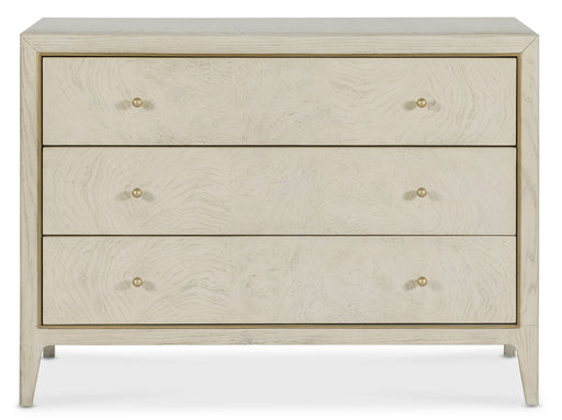 A blend of romantic curves and refined finishes, the Wanderlust Chest is crafted from ash burl veneers in a light greige hue, accented by gold trim...