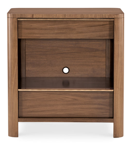 The Eleana Two Drawer Nightstand offers refined storage with its Light Caramel walnut veneer finish and Sunlit Bronze hardware. With two self-closi...