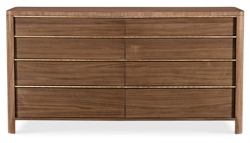 The Eleana Eight Drawer Dresser exudes timeless elegance with its Light Caramel walnut veneers and Sunlit Bronze hardware. It features eight self-c...