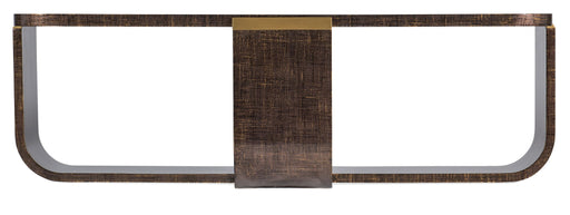 Symmetrical and stylish, the Nolita Entertainment Console is crafted of Oak Veneers in a black finish with hammered champagne-colored metal circle-...