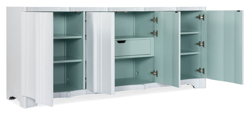 A soft modern silhouette with classical inspiration, the Corinth Entertainment Console has a white plaster finish with light blue interior, bracket...