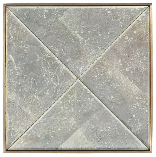 Metal diamond-shaped fretwork in a champagne finish creates a timeless silhouette to uplift any space. The Golden Madrone Burl tabletop adds richne...