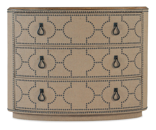 Featuring carved drawer fronts and a Moroccan vibe, this Boho beauty has an antique white finish with brown rub-through over Pecan veneers. Subtle ...