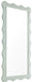 Elevate your entryway or bedroom with the Waverly Leaner Mirror, featuring a scalloped silhouette, beveled glass, and a unique blue-green painted raffia frame. A bold blend of texture and color for modern eclectic spaces.