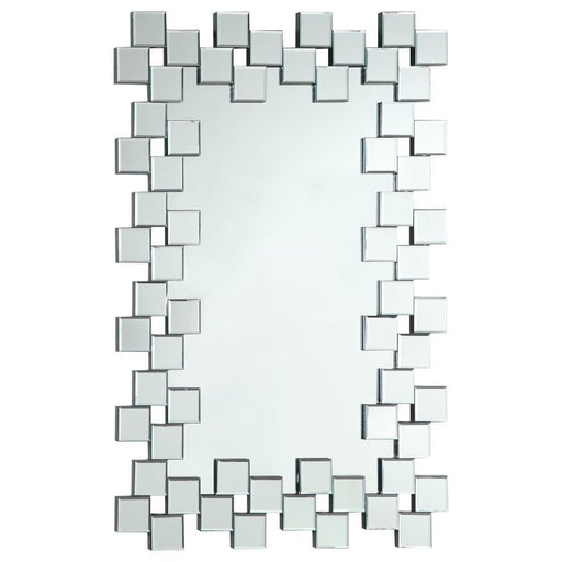 Add striking dimension to any room with this frameless wall mirror featuring a geometric mosaic edge. The center rectangular mirror is bordered by ...