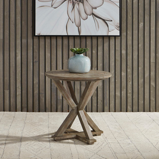 Elevate your space with the contemporary Parkland Falls round end table. Crafted of pine solids and knotty pine veneers, this piece features a weat...