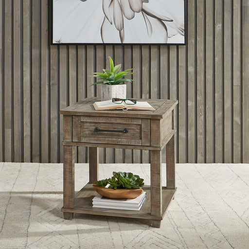 Accent your space with the casual Parkland Falls rectangular end table. Crafted of pine solids and knotty pine veneers, this piece features a weath...