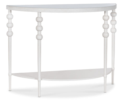 This half-moon console table offers soft sophistication with its white textured finish and beveled white-glass top. A single lower shelf enhances i...