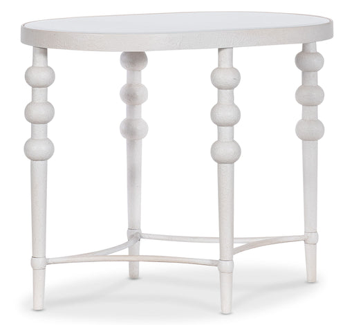 With its white textured finish and beveled glass inset, this oval end table brings light and elegance to your décor. Ideal for minimalist or coasta...