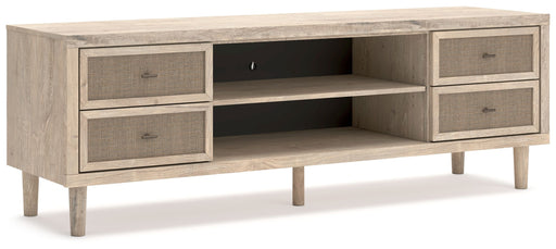 Clean-lined and contemporary—but far from stark—this TV stand is a fresh style awakening. Pairing a light finish with replicated oak grain and text...