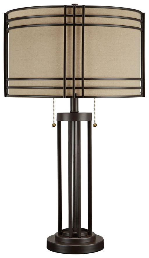 Add a touch of rustic industrial style to your decor with this eye-catching table lamp. Its drum shade and decorative metal frame bring an appealin...