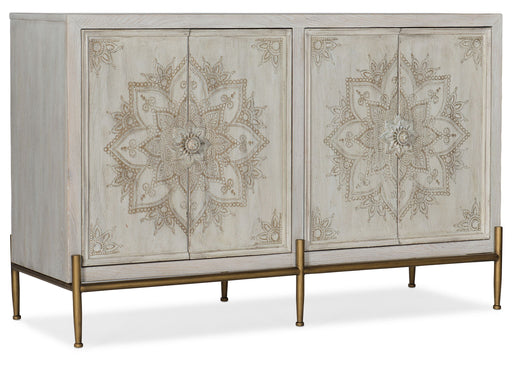 Dark and handsome meets shimmery and romantic with the alluring Rosella Console. Hand-painted eglomise glass with a silver leaf pattern on the door...