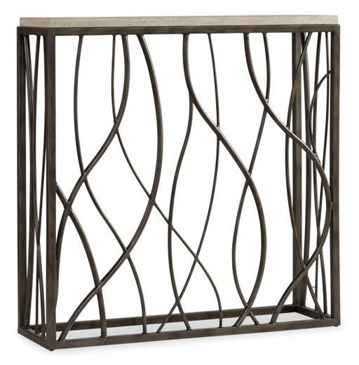 Organic and modern, this striking console table in a neutral color palette has a curvy steel base and natural stone top of Travertine Marble to cre...