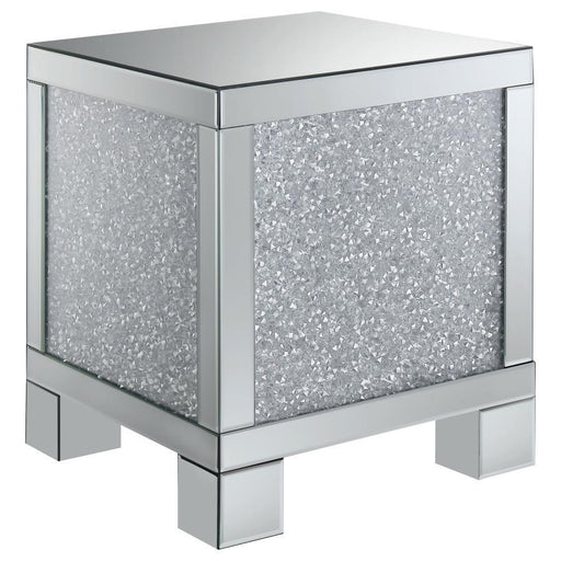 This 20-inch square mirrored end table brings a touch of glam to any space. Its engineered wood frame is adorned with shimmering acrylic crystal ac...