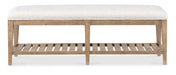 Inspired by the organic beauty of California wine country, the Vineyard Row Bed Bench is a chic and functional piece ideal for the foot of a bed or even for extra seating in a hall or bedroom. The seat is upholstered in the White Zin fabric, a perfect complement to the light and airy Sonoma finish over the wood frame and slatted bottom shelf. 24 inches long.