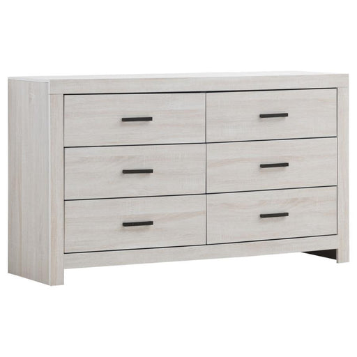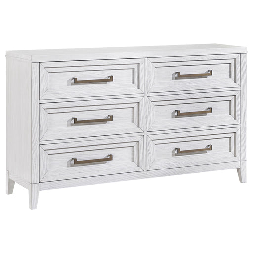 Light distressing offers depth and dimensionality to a modern six-drawer dresser. Perfect for clothing and other accessories, it features a double ...