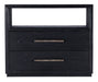 With the aura of a rustic mountain cottage, the Linville Falls Two-Drawer Nightstand has an airy feel with an open area at the top and two self-closing drawers. Crafted of Pine Veneers, the nightstand is finished in Shadow, a charred black finish achieved through Shou Sugi Ban, a Japanese technique that creates a look resembling burnt wood. Textured metal bar pulls in an antique pewter finish add an organic accent. Functional features include a double USB charging port and a cord clip on the back.