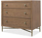 A stylistically versatile nightstand blending natural textures with a light-and-airy modern aesthetic, the Sonnet Nightstand has 3 self-closing drawers and a metal base, stretcher and tapered legs. Crafted of Quartered and Cathedral-Cut White Oak Veneers in a light earthen-toned finish, the nightstand has a cord clip on the back and satin-finished champagne-colored knobs.