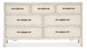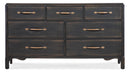 In a classic, charming design with a nostalgic flair, the American Dresser is crafted of Oak Veneers with a Solid-Wood Edge Top, a scalloped-shape base and finished in the deep, dark Molasses finish. There are 7 self-closing drawers, with the top left and right drawers with black removable felt liners. The center drawer has a black liner and black removable jewelry tray. The bottom two drawers are cedar-lined. Metal alloy pulls are in an antique bronze finish.