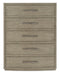 With a rustic weathered finish and clean modern lines, the Pisgah Chest has five self-closing drawers, with the top two drawers featuring drop-in felt liners, and the bottom drawer is cedar-lined. Crafted of Oak Veneers, the dresser is finished in the soft smoked gray Mink. Textured metal bar pulls in an antique pewter finish add an organic accent.