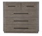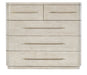 Softly sophisticated with a clean modern profile and luxe mixture of materials, the Modern Mood Bachelor’s Chest is a stunning statement piece. The case has rounded corners and a plinth base and offers five self-closing drawers. The top two drawers are felt-lined, and the bottom drawer is cedar-lined. Crafted of Oak Veneers, the nightstand is finished in the serene Diamond color and accented by metal pulls wrapped in leather.