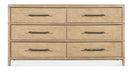 Inspired by tropical getaways, the Retreat Pole Rattan Dresser is a blend of natural materials in a laid-back, versatile design. Crafted of Oak and Maple Veneers with Rope accents, the dresser is finished in Sand, transparent by design to reveal the unique grain patterns in the wood veneer. Offering six self-closing drawers, the top left drawer has a removable felt liner and the top right drawer has a removable felt liner. The bottom two drawers are cedar-lined. The textured, pewter-colored bar pulls add a look of natural elegance.