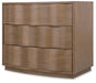 A stylistically versatile dresser blending natural textures with a light-and-airy modern aesthetic, the Sonnet bow-front Bachelors chest has 3 push-open drawers with shaped-wave drawer fronts. Crafted of Quartered and Cathedral-Cut White Oak Veneers, it has a light earthen-toned finish. The top drawer has a cream-colored removable drop-in left liner. The plinth base adds chic modern appeal.