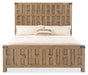 Inspired by California wine country and influenced by the craftsman architecture of the region, the stunning Vineyard Row Panel Bed has a cutout fretwork design on the headboard and footboard and rustic, hammered metal accents. It is crafted of Pecky Hickory Veneers. Includes the headboard, footboard and rails.