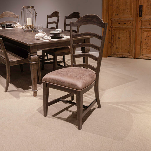 Sit in comfort with the Magnolia Manor splat back upholstered chair. Finished in an antique with heavy chipping and crafted of rubberwood solids, t...