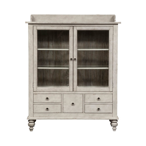 Crafted of rubberwood solids and oak veneers. Features heavy top crown molding, two picture framed doors with seeded glass, one shelf, two bluff cu...