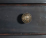 This heirloom-quality server honors the sophisticated beauty and drama of the Federal and Georgian design periods. Crafted of Cherry Veneers with a Solid-Wood Edge top, it is finished in the vibrant Black Cherry patina with subtle distressing. Designer accents include fretwork on the edges, scroll brackets below the center drawer, six turned, carved legs and decorative ring pulls and carved round knob hardware in an antique bronze color. There are five self-closing drawers, each with cherry finish on the drawer interiors. The left and right top drawers have removable felt liners and the center drawer has a removable felt-lined silverware tray. Shaped bottom shelf.