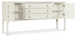 Create a comfortable and inviting retreat within your home with the Cove Shore Server, a piece that will help you extend hospitality with ease and grace. Crafted of wood and raffia, it is offered in the white lacquered grasscloth Sand Dollar finish with light champagne decorative pulls and chow legs giving a designer touch. There are 2 soft-close doors and one adjustable shelf behind each door. Three drawers with soft-close drawer guides. The top drawer has a removable black felt liner and removable black silverware tray.