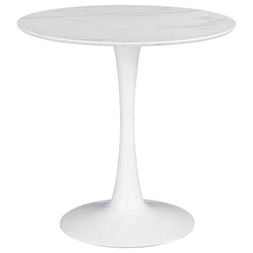 Based off an iconic furniture design, this round dining table is perfect for compact dining spaces. Its bright white faux marble top and metal base...
