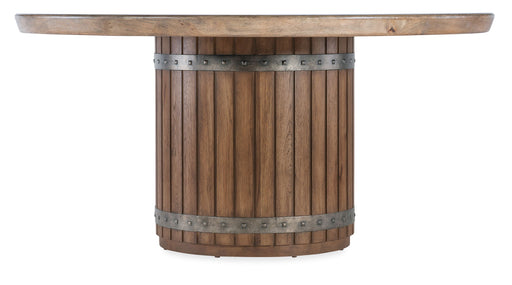 Inspired by the casual wine country lifestyle, the 62-inch-round Vineyard Row Dining Table has a wine-barrel-shaped base and a two-tone finish comb...
