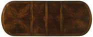 As inviting as it is stunning, the Leesburg oval-shaped leg table features a deep, rich traditional finish with exquisite cathedral and swirl mahogany veneers and light physical distressing. The tabletop has beautiful decorative veneers that will elevate each meal. Table offers two 18-inch leaves and will seat up to 8 guests with both leaves in use.