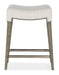 Nostalgic and chic with the aura of a rustic mountain cottage, the Green Valley Counter Stool has a wood frame in a rectangle shape finished in the smoked gray Mink color, and a fabric seat covered in the neutral performance texture Remington Porcelain. Nailhead trim gives a designer touch.