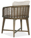 Create a calming resort-inspired retreat in your home with the laid-back Sundance Barrel Back Chair. The appealing lattice design of the cane seat back combines with a loose back pillow and an upholstered seat covered in the Zuri Cream performance fabric to invite you to linger and relax. The legs, arms and X-style stretcher are finished in Cliffside, a rich brown finish with light burnishing on the edges.