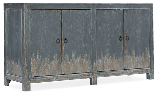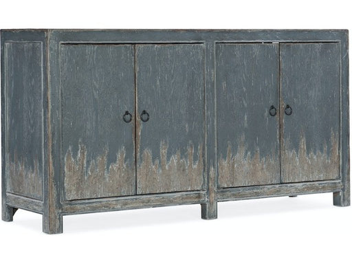 With the allure of an impressionistic painting, the Mediterranean Entertainment Credenza has four white and blue ombre-colored textured door fronts...