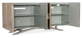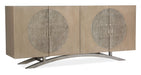 Symmetrical and stylish, the Nolita Entertainment Console is crafted of Oak Veneers with hammered champagne-colored metal circle-shaped door fronts, silver drop pendant pulls and an arched metal base. There’s one adjustable shelf behind each pair of doors, a ventilated back panel with wire management and hand holes and a power supply. Accommodates up to a 75-inch TV.