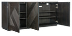 Tranquil and modern with a tropical retreat-inspired vibe, the Retreat Entertainment Center has a striking carved wave motif on the door fronts. Crafted of Oak Veneers and Resin, the case is finished in the Black Sand finish, while the door fronts have a lighter contrasting finish. The entertainment center features three doors with soft-close hinges and touch-latches, two adjustable shelves behind the left door, two adjustable shelves behind the pair of right-side doors, a ventilated back panel and a three-plug electrical outlet located behind the pair of right doors.