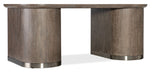 Offered in a clean and unmistakably modern aesthetic that transcends time, the Modern Mood Executive Desk is a statement piece packed with functional features. The Diamond Finish over wire-brushed Quartered Oak Veneers with crystal-like alabaster and pewter hues delivers a soft sophistication, while the metal banding and edging on the base and round metal knobs wrapped in leather offer a mixed-media eclecticism. Features include two locking file drawers with Pendaflex letter/legal filing system, 4 utility drawers, two top left drawers with removable dividers and a top right drawer with removable mouse pad and pencil tray that can be used in either side top drawer. There are locks on the inside of the kneehole area and levelers.