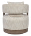 Curvy, chunky and chic, the cool contemporary Calloway Peak Swivel Chair has a fabric seat and back, accented by a loose pillow. The wood base and arm fronts are crafted of Oak Veneers in an organic soft smoked gray Mink finish. The upholstered cover is Daphne Parchment.