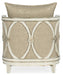 Like resort wear, the Mariette Lounge Chair is casual and breezy yet elegant. The striking wood frame features repeated ovals around the sides and back, punctuated by center flower medallions. The dreamy Chalet finish is a two-tone color combining Latte, a light wood and Blanc, a creamy white accented with champagne and silver tipping. The Glitter Pearl performance fabric is shimmery and soft. Loose pillow back.