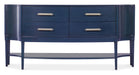 A classic credenza silhouette gets a refreshing update in the Mazarine, featuring a serpentine-shaped front, rich dark blue finish over Cherry Veneers and fluted tapered legs. The modern pewter-colored stacked bar pulls add a contemporary flair. One fixed shelf and four self-closing drawers.