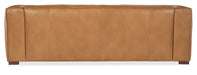 A sleek, low-profile silhouette with wide track arms, wood block feet and flange welt trim are paired with a warm and inviting caramel-colored luxurious semi-aniline leather cover in the 95-inch wide Maria two-seat Sofa.