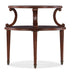 With flair and grace, the two-tiered Charleston Side Table has two surfaces separated by decorative carved wood scrolls in all 4 corners. This distinctive piece has antique bronze metal ferrules on the feet, tapered legs, carved accents and an inlay border on the top. Crafted of Cherry Veneers with Walnut Inlay, it is finished in Maraschino Cherry using natural grain Cherry Veneers showcasing cathedral patterns in the wood.