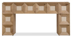 The Haven Console Table from the Commerce & Market collection offers a mix of natural oak and luxurious travertine marble. The medium natural oak finish highlights the faceted "window pane" design on the table, while the marble accents inset into the panels add sophistication. With a timeless, casual style, this table works beautifully in living rooms or entryways, combining practicality with an elegant touch.