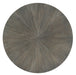Beautifully scaled and intricately designed, this round table pairs a tabletop and bottom shelf crafted of Acacia Veneers with a starburst veneer pattern in a finish with a metal frame.