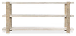 Crafted of Oak Veneers with an open grain pattern with rope-wrapped supports, the Commerce & Market Console Table has a light and airy natural wood finish, a tactile quality and a youthful vibe. Two fixed shelves with open sides and back.